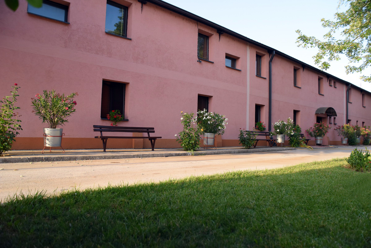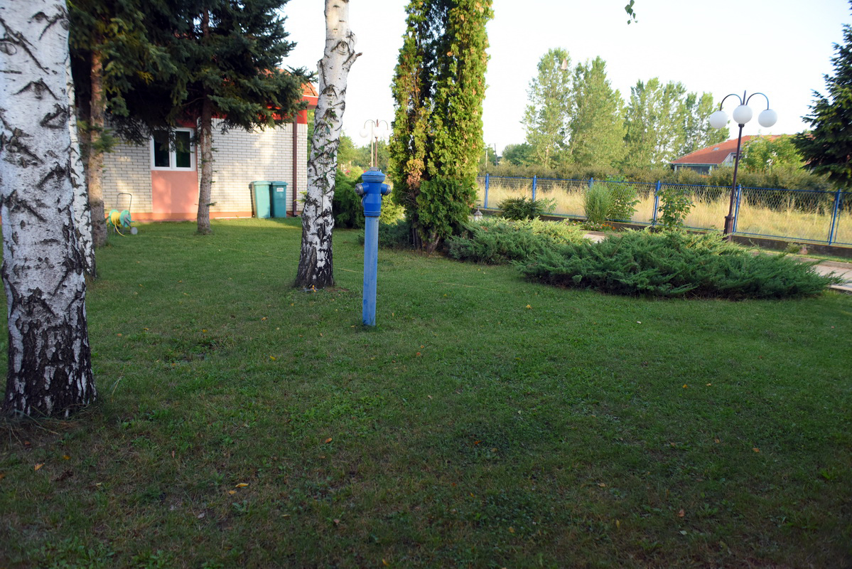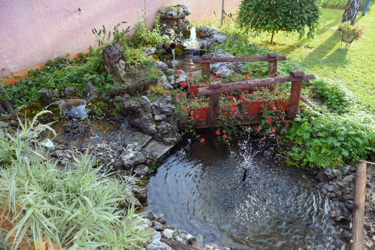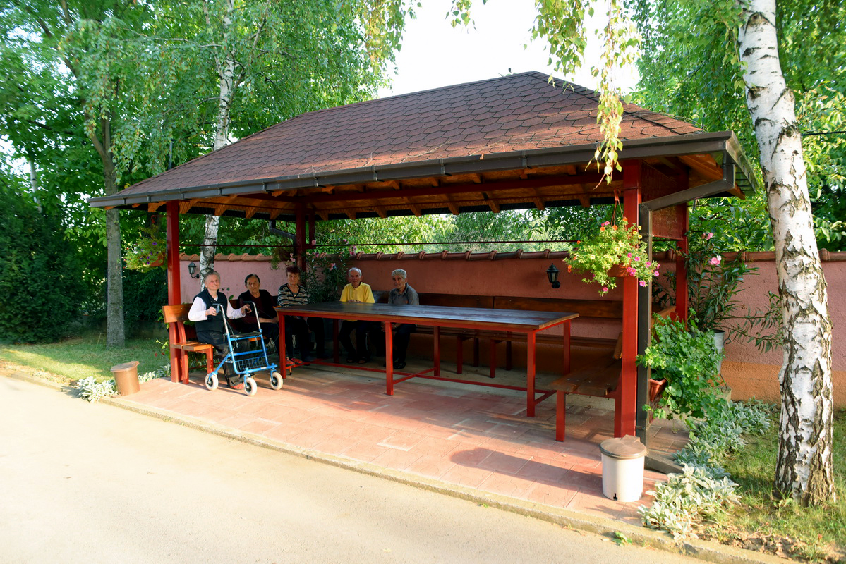 Prostrano dvorište Doma za stare „Sunčana jesen“ odlikuje se zelenilom, cvećem, fontanom, letnjikovcem i mnogim klupama za odmor.